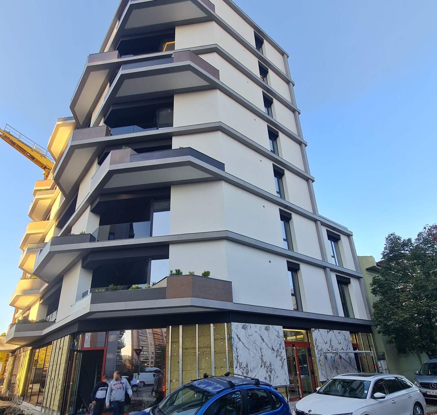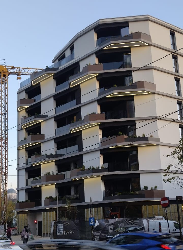 Fațada clădirii se distinge printr-un design elegant și eficient energetic, datorită utilizării